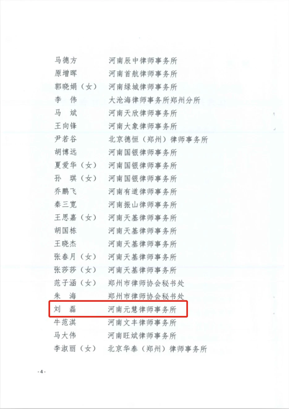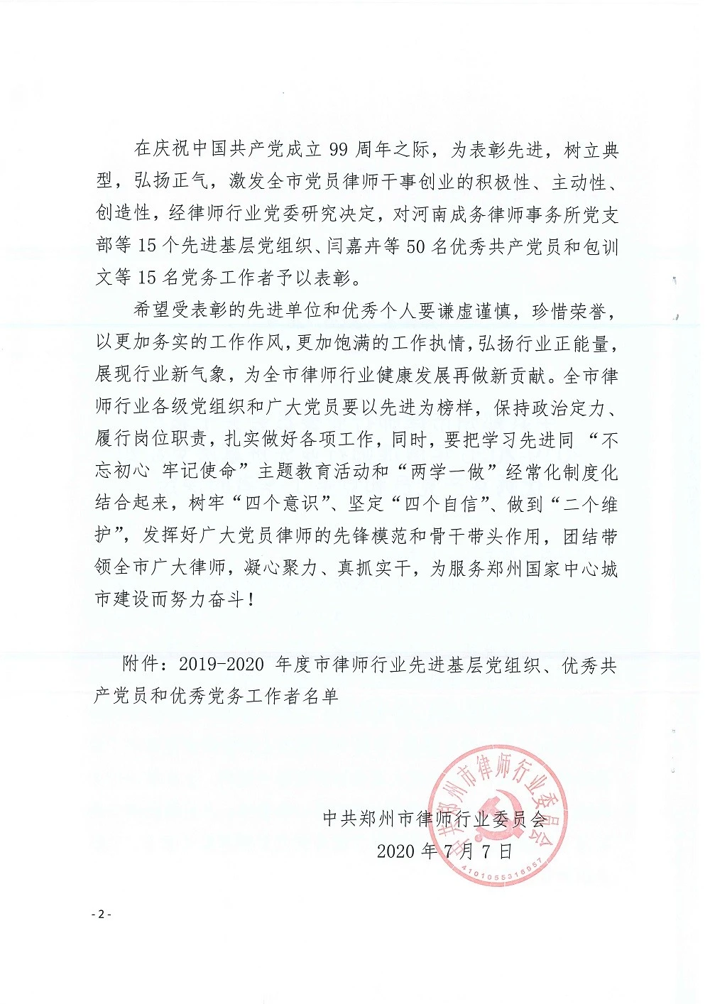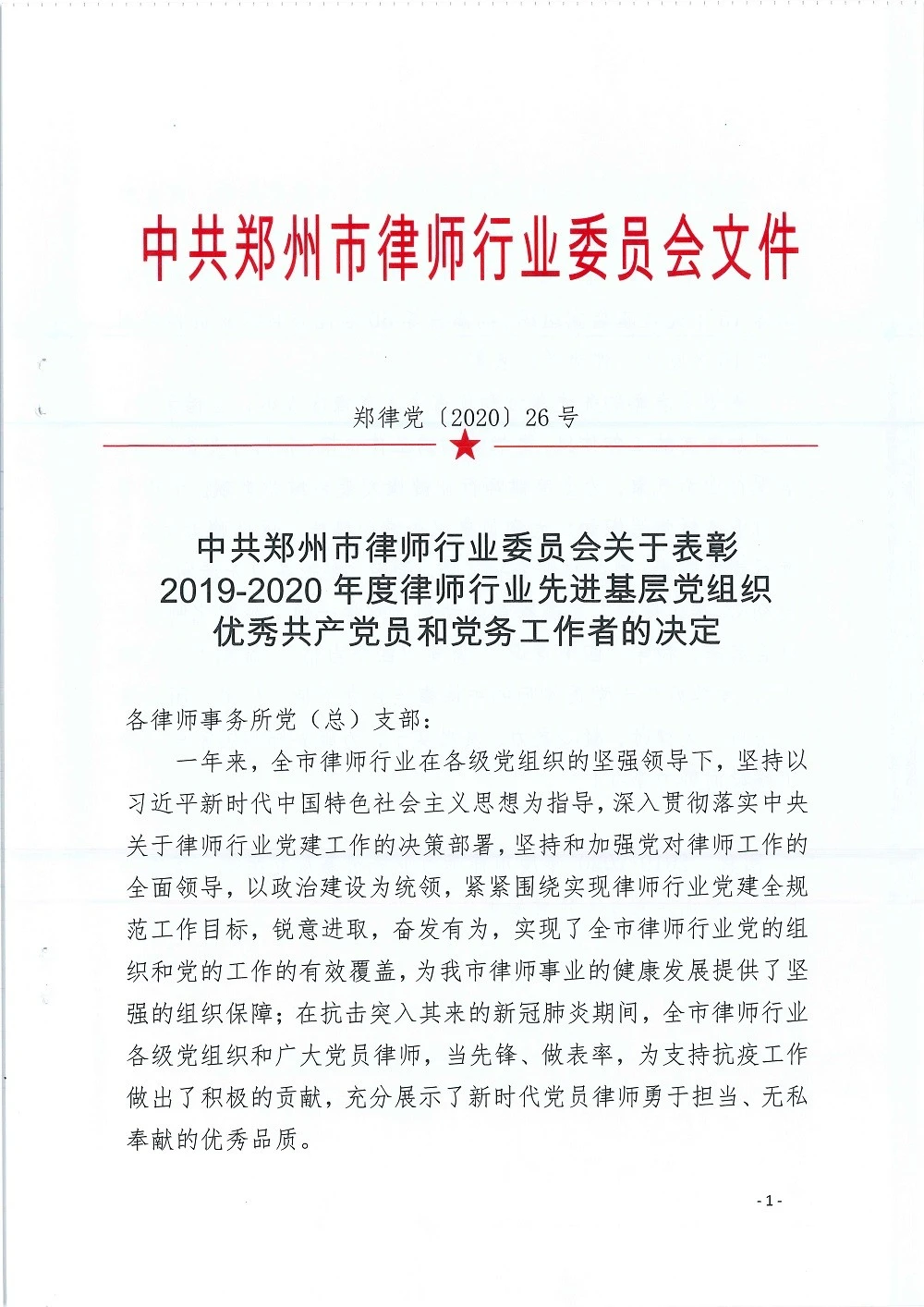 2020年7月7日,中共郑州市律师行业委员会发布《中共郑州市律师行业委员会关于表彰2019-2020年度律师行业先进基层党组织优秀共产党员和党务工作者的决定》,该决定评定我所元慧党支部副书记刘磊为“优秀共产党员”。